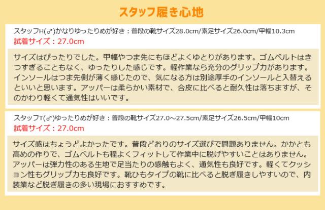 | 素材・仕様 | アッパー:ポリエステルメッシュ+合成皮革 ソール:EVA+合成ゴム インソール:取外し可 先芯:樹脂先芯 靴幅:EEE(3E) 重量:約286g(26.0cm片足計測) | |||||