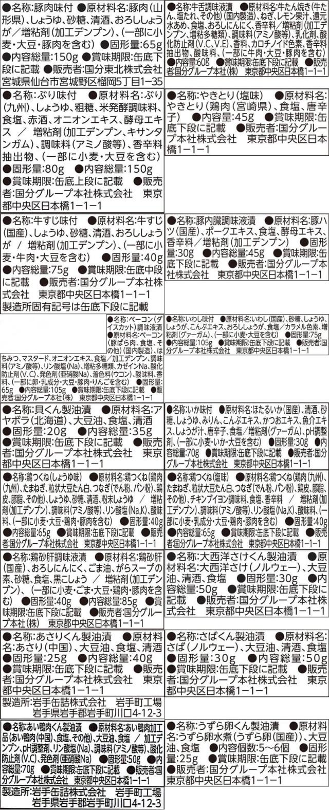 缶つま 山形県産 金華豚角煮 150g 缶つま 牛タン 焼き ねぎ塩だれ 60g 缶つま 九州産 ぶり あら炊き 150g 缶つま 宮崎県産 日南どり炭火焼 45g 缶つま 国産 牛すじ 煮込み 75g 缶つま 国産 和豚もちぶた ハツ塩味 45g 缶つま 厚切り ベーコン ハニーマスタード 105g 缶つま 日本近海獲り 和風 サーディン 105g 缶つま 北海道産 つぶ貝燻製油漬け 35g 缶つま 日本海獲り ほたるいか 沖漬け 風 70g 缶つま 九州産 鶏つくね 焦がし醤油味 65g 缶つま 九州産 鶏つくね 塩だれ味 65g 缶つま 国産 鶏砂肝 黒胡椒香る塩だれ味 85g 缶つま スモーク 鮭ハラス 50g 缶つま スモーク あさり 40g 缶つま スモーク さば 50g 缶つま スモーク あい鴨 70g 缶つま スモーク うずら卵 25g 18種 18缶 |