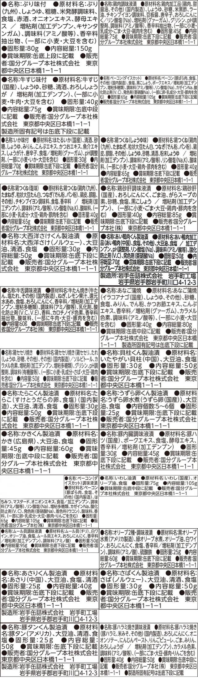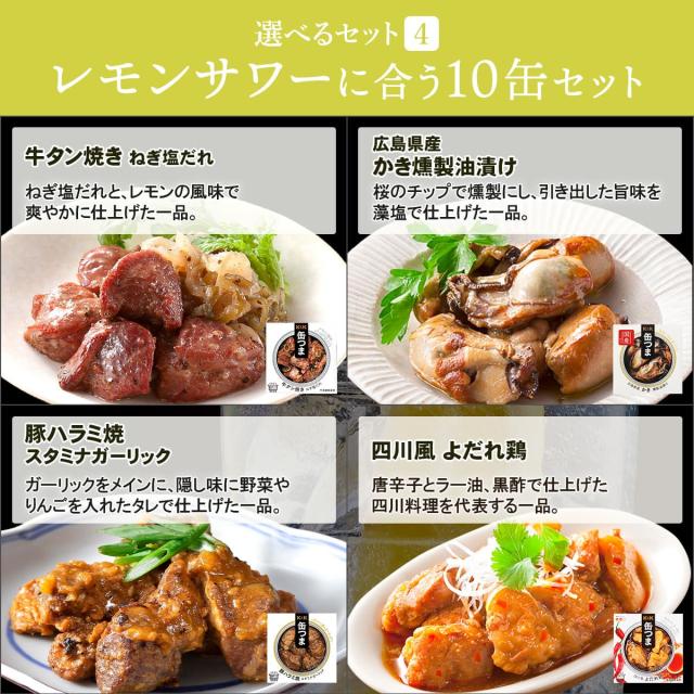 ■ ビールに合う 10缶セット 缶つま 九州産 ぶり あら炊き 150g 缶つま 四川風 よだれ鶏 75g 缶つま 国産 牛すじ 煮込み 75g 缶つま 厚切り ベーコン ブラックペッパー 105g 缶つま 日本海獲り ほたるいか 沖漬け 風 70g 缶つま 九州産 鶏つくね 焦がし醤油味 65g 缶つま 九州産 鶏つくね 塩だれ味 65g 缶つま 国産 鶏砂肝 黒胡椒香る塩だれ味 85g 缶つま スモーク 鮭ハラス 50g 缶つま スモーク あい鴨 70g ■ 焼酎・日本酒に合う 10缶セット 缶つま 牛タン 焼き ねぎ塩だれ 60g 缶つま 国産 あなご 蒲焼 80g 缶つま 鶏セセリ 直火焼 50g 缶つま 日本海獲り ほたるいか 沖漬け 風 70g 缶つま 九州産 鶏つくね 塩だれ味 65g 缶つま 国産 鶏砂肝 黒胡椒香る塩だれ味 85g 缶つま スモーク 鮭ハラス 50g 缶つま スモーク 貝柱 50g 缶つま スモーク たらこ 50g 缶つま スモーク うずら卵 25g ■ ワイン・洋酒に合う 10缶セット 缶つま 広島県産 かき 燻製 油漬け 60g 缶つま 国産 和豚もちぶた ハツ塩味 45g 缶つま 厚切り ベーコン ハニーマスタード 105g 缶つま 日本近海獲り オイルサーディン 105g 缶つま ムール貝 の 白ワイン 蒸し 風 95g 缶つま ミックスオリーブ 60g 缶つま スモーク あさり 40g 缶つま スモーク さば 50g 缶つま スモーク あい鴨 70g 缶つま スモーク 豚タン 50g ■ レモンサワーに合う 10缶セット 缶つま 牛タン 焼き ねぎ塩だれ 60g 缶つま 広島県産 かき 燻製 油漬け 60g 缶つま 豚ハラミ焼 スタミナガーリック 50g 缶つま 四川風 よだれ鶏 75g 缶つま 国産 牛すじ 煮込み 75g 缶つま 九州産 鶏つくね 塩だれ味 65g 缶つま 国産 鶏砂肝 黒胡椒香る塩だれ味 85g 缶つま スモーク 鮭ハラス 50g 缶つま スモーク 豚タン 50g 缶つま スモーク うずら卵 25g 4種類のセットからお選びいただけます。 |