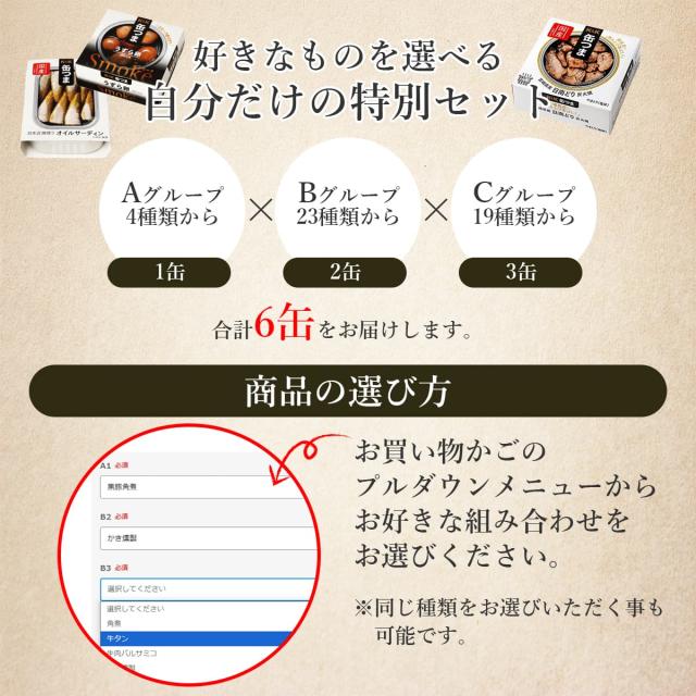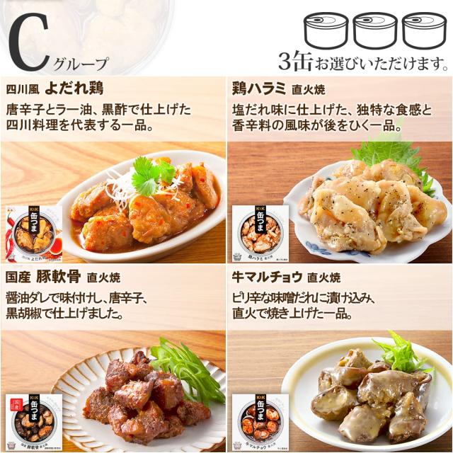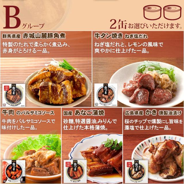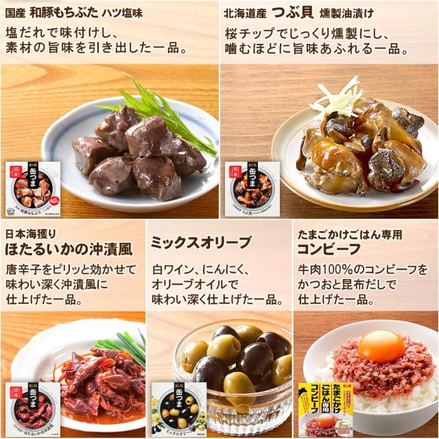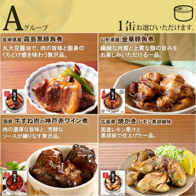 ■Aグループ1缶 缶つま 宮崎県産 霧島黒豚角煮 150g 缶つま 山形県産 金華豚角煮 150g 缶つま 国産牛すね肉の神戸赤ワイン煮 160g 缶つま 広島県産 焼かき レモン黒胡椒味 70g ■Bグループ2缶 缶つま 群馬県産 赤城山麓豚 角煮 150g 缶つま 牛タン 焼き ねぎ塩だれ 60g 缶つま 牛肉 の バルサミコソース 70g 缶つま 国産 あなご 蒲焼 80g 缶つま 広島県産 かき 燻製 油漬け 60g 缶つま 北海道 噴火湾産 ほたて 燻製 油漬け 55g 缶つま 九州産 いか明太 40g 缶つま 九州産 ぶり あら炊き 150g 缶つま 豚ハラミ焼 スタミナガーリック 50g 缶つま 湖南風 豚肉の旨辛スパイス 75g 缶つま 鶏セセリ 直火焼 50g 缶つま 宮崎県産 日南どり炭火焼 45g 缶つま 北海道産 鶏ぼんじり 直火焼 40g 缶つま 国産 牛すじ 煮込み 75g 缶つま コンビーフ ユッケ 風 80g 缶つま 厚切り ベーコン ブラックペッパー 105g 缶つま 厚切り ベーコン ハニーマスタード 105g 缶つま 日本近海獲り オイルサーディン 105g 缶つま 日本近海獲り 和風 サーディン 105g 缶つま ムール貝 の 白ワイン 蒸し 風 95g 缶つま スモーク かき 50g 缶つま スモーク たこ 50g 缶つま スモーク あい鴨 70g ■Cグループ3缶 缶つま 四川風 よだれ鶏 75g 缶つま 鶏ハラミ 直火焼 50g 缶つま 国産 豚軟骨 直火焼 40g 缶つま 牛マルチョウ 直火焼 50g 缶つま 国産 和豚もちぶた ハツ塩味 45g 缶つま 北海道産 つぶ貝燻製油漬け 35g 缶つま 日本海獲り ほたるいか 沖漬け 風 70g 缶つま ミックスオリーブ 60g たまごかけごはん専用コンビーフ 80g 缶つま 九州産 鶏つくね 焦がし醤油味 65g 缶つま 九州産 鶏つくね 塩だれ味 65g 缶つま 国産 鶏砂肝 黒胡椒香る塩だれ味 85g 缶つま スモーク 鮭ハラス 50g 缶つま スモーク 貝柱 50g 缶つま スモーク たらこ 50g 缶つま スモーク あさり 40g 缶つま スモーク さば 50g 缶つま スモーク 豚タン 50g 缶つま スモーク うずら卵 25g 46種類の中から6缶お選びいただけます。 |