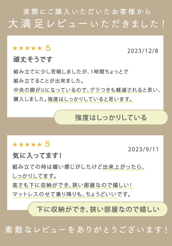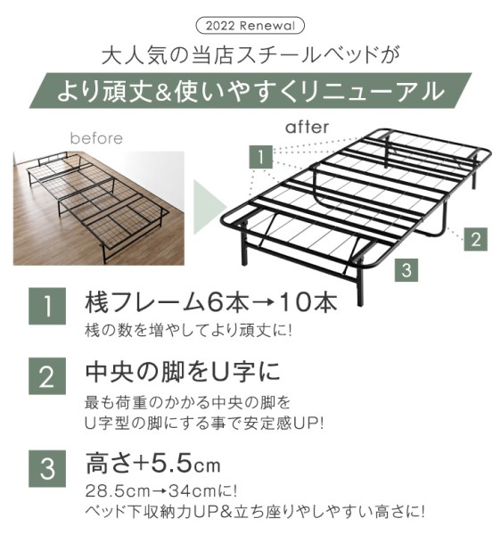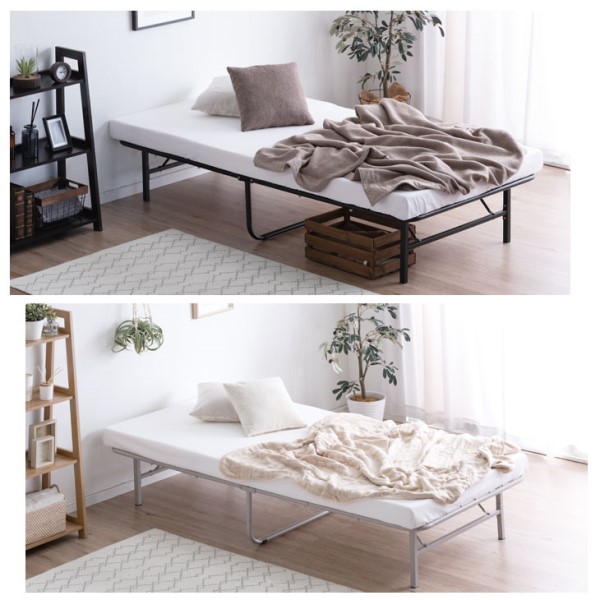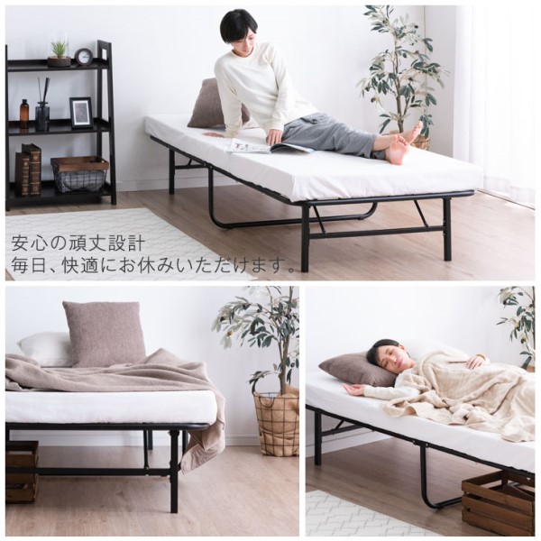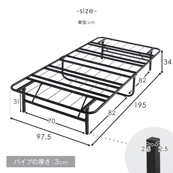 - 組み立てが簡単で折りたたみなので使い勝手が良いです ただ、10cmの厚さのマットレスだとパイプの間で凹凸ができ少し体が痛い感じなので硬めの厚いマットか硬めの下敷きが頭た方が気持ちよく寝れます