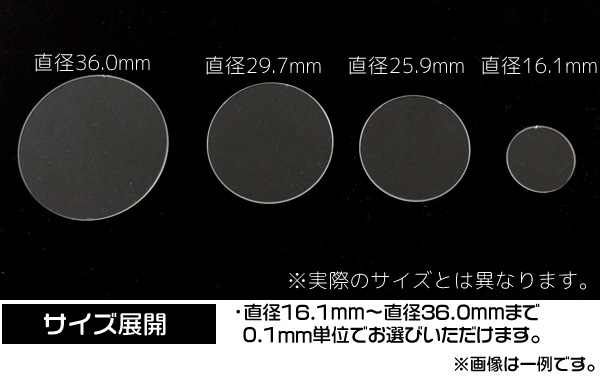 オリジナルの時計を製作している方におすすめ!お気に入りの腕時計のガラスが割れてしまった時にもご活用いただけます!サイズは直径16.1〜36.0mmまで0.1mm単位でお選びいただけます!