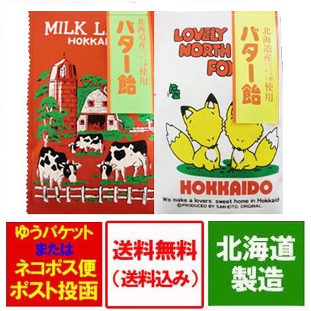 北海道 バター飴 送料無料 バター 飴 北海道産のバター 使用した バターあめ キツネのパッケージ1袋と牛柄のパッケージ1袋 計2袋セット ポイント消化 送料無料 飴 スイーツ お菓子 あめ キャンディ