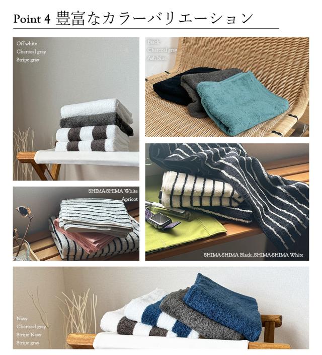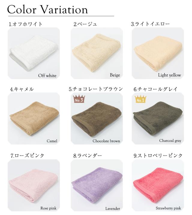 クセになる柔らかさと吸水性。ご家庭で高級ホテルにいるような上質で贅沢な心地よさを味わって頂くために。カラーバリエーションは17色、ハンドタオル・フェイスタオル・コンパクトバスタオル・バスタオル・ビッグバスタオルの5サイズからお選び頂けます。