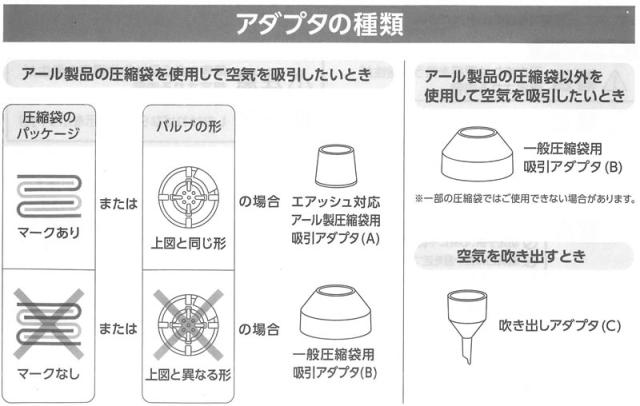 他社製バルブ式圧縮袋も対応アール製圧縮袋専用アダプターのほか、他社製圧縮袋にも対応できる一般圧縮袋用アダプターが付属。※一部圧縮袋では使用できない場合があります。