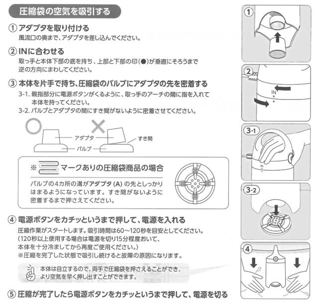 布団や衣類のバルブ式圧縮袋用の電動吸引機。