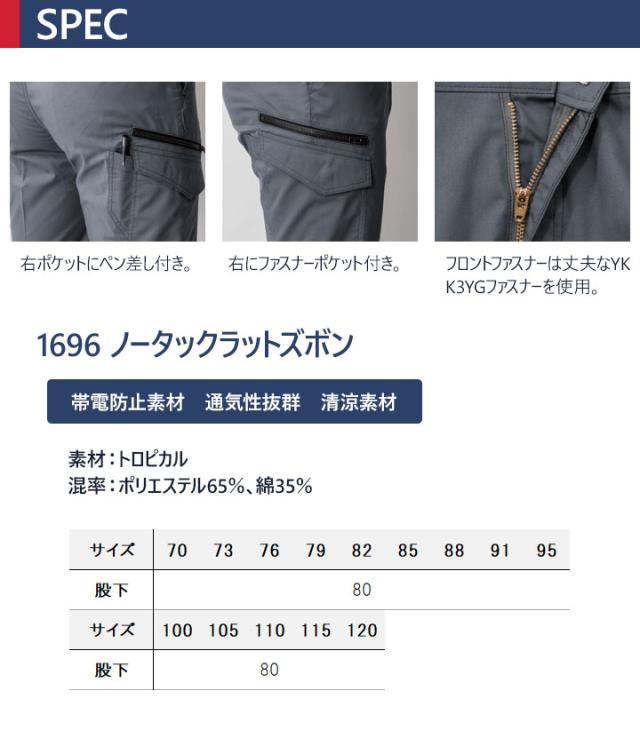 ラットズボン ジーベック 1696 通気性抜群 帯電防止 軽量 ノータック パンツ 作業服 作業着 春夏 ユニフォーム 1694シリーズ XEBEC