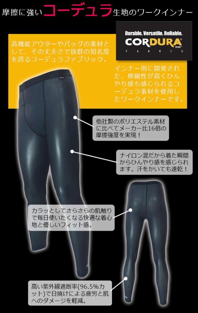 | ALPHA-FORCE(アルファフォース)の軍服やカバンに使われる高強度素材コーデュラナイロンを使用したクールロングタイツです。 耐久性が高く、同目付けのポリエステルベア天竺と比較し、擦れの強さは16倍の強度です(メーカー比)。 ほどよいゆるピタ着圧で、なめらかな肌触りの履いた瞬間からひんやり涼しい「接触冷感機能」、乾きが速くベタつかない「吸汗速乾機能」、高い紫外線遮断率とUPF値で有害な紫外線から守る「UVカット機能」がついています。 ハードな現場やスポーツ、アウトドアに最適な夏場に大活躍のアイテムです。 | ||||||