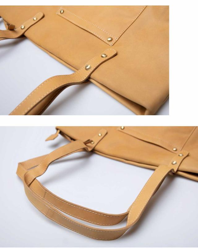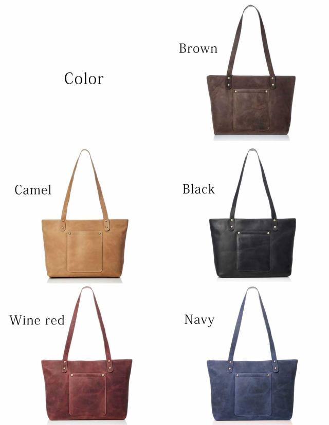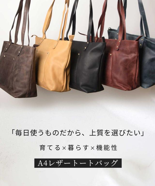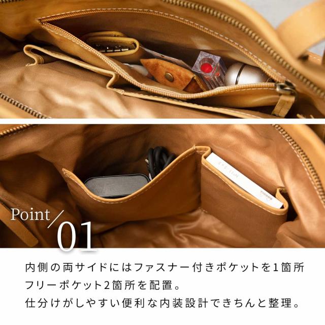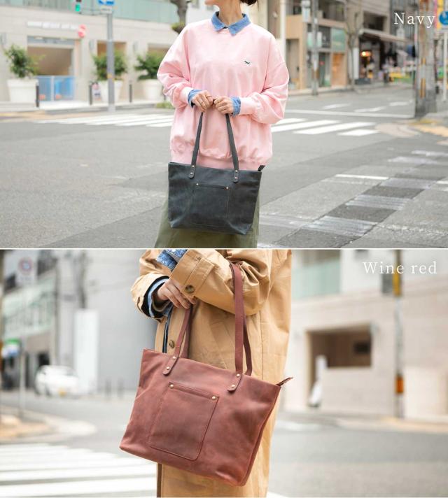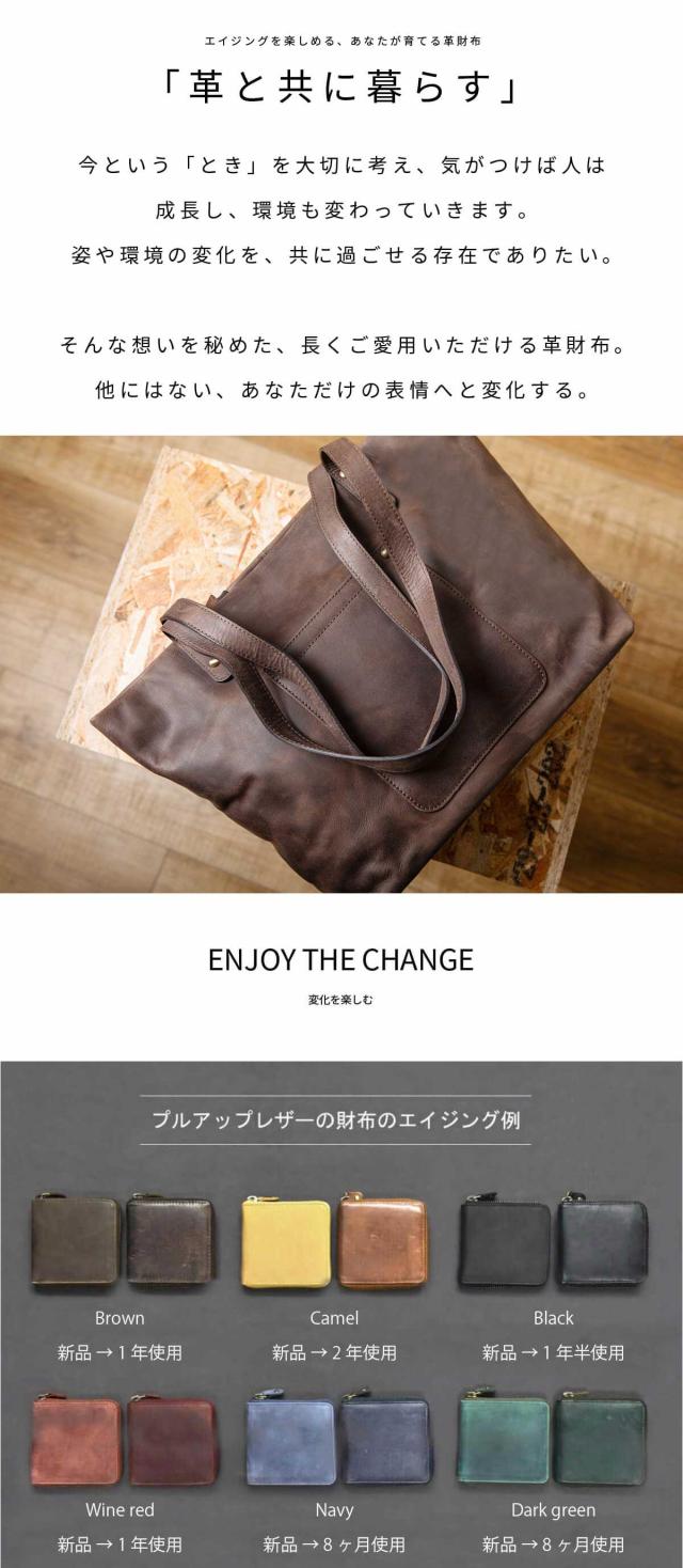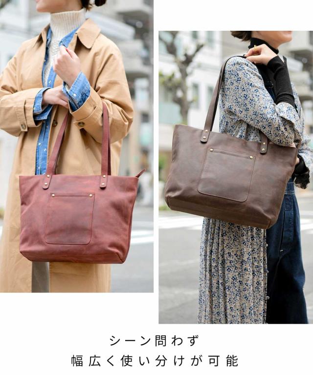 [どこにでも連れて行ける「ちょうど良い」サイズのトートバッグ]男性女性どちらも使いやすいデザイン。ビジネスやちょっとした旅行にも対応したトートバッグ。表面のポケットはスマホやICカードもすっぽり収まります。内側にはファスナーポケット1ヶ所と仕分けポケットが付いているのでイヤホンやリップクリームといった小物類が収納できます。また、アクセントでタッセルをプラスしても華やかになります。全面に使用しているプルアップレザーは、オイルを多く含んだ革なので使い込むほどにツヤと深みが増していき、エイジング(経年変化)を楽しみながら長く愛用していただけます。あなただけの風合いに変化していく様子をぜひお楽しみください。容量:11.9L