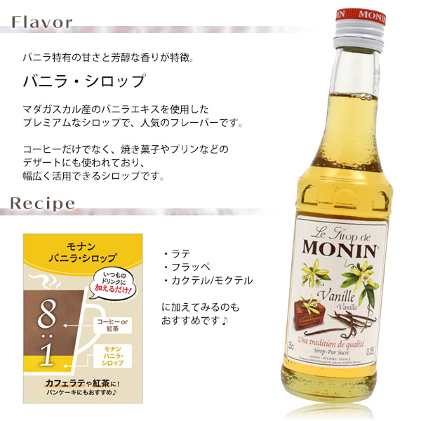 モナン バニラ シロップ 250ml ミニサイズ MONIN ノンアルコールシロップ コーヒー ラテ カクテル 割り材 プリン 焼菓子 材料 うちカフェ バー トッピング coffee カフェラテ デザート アイス スムージー パンケーキ ホットケーキ ケーキシロップ coffee 自宅で cafe