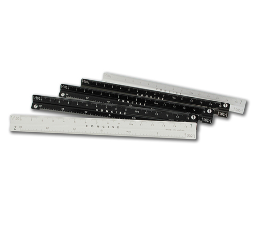 ○1/100、1/200、1/300、1/400、1/500、1/600 の計6種類の縮尺が刻まれた三角スケール