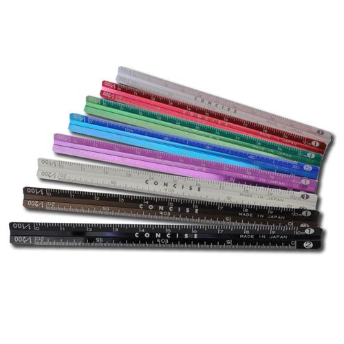 幅9mmの極細ボディでポケットやペンケースに収まる携帯性。1/100・1/200・1/300・1/400・1/500・1/600の6縮尺を刻印し、レーザー加工の精密目盛で擦れに強く長く使えます。オールアルミ製(リサイクルアルミ100%)で耐久性に優れ、木製・樹脂製に比べ誤差が少ないのが特長。