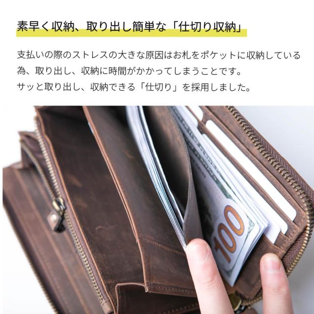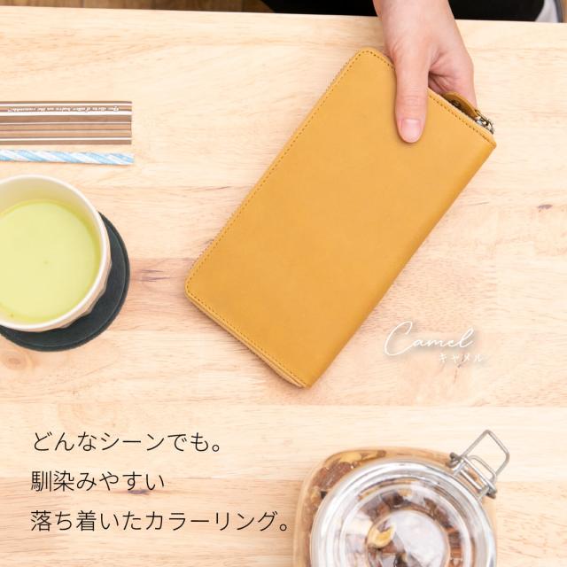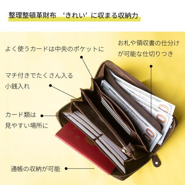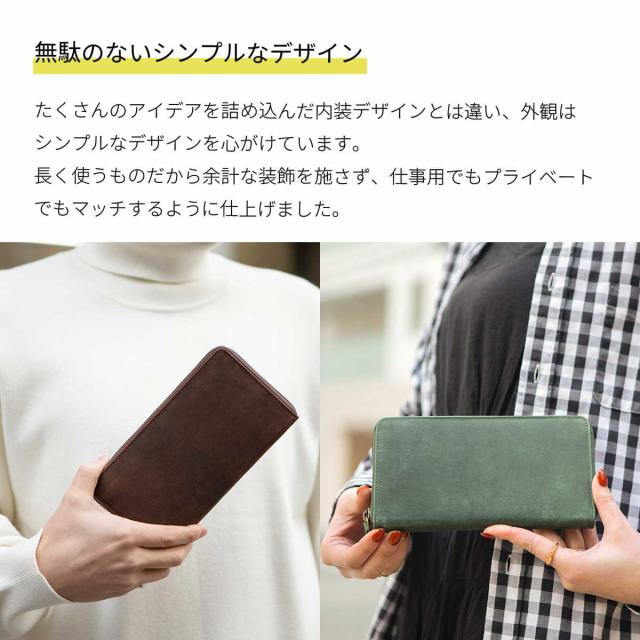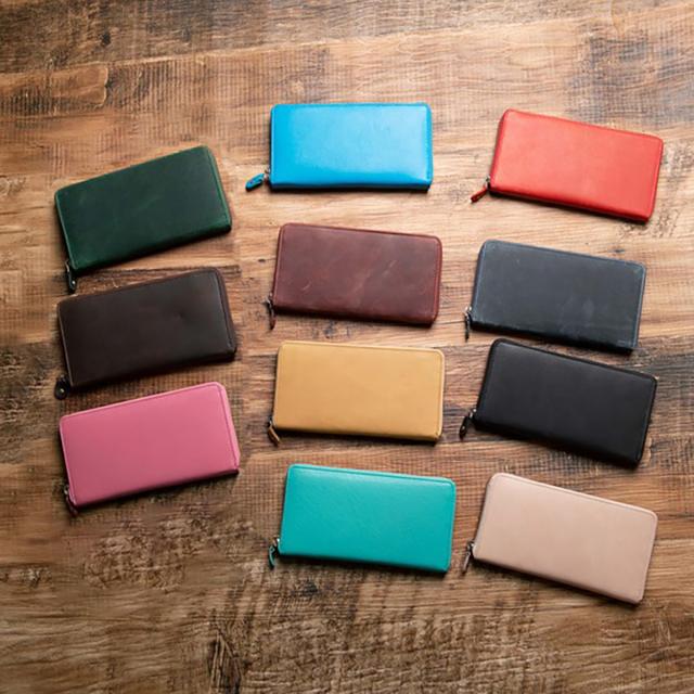 【Point1】小銭・お札はもちろん領収書や名刺・通帳まで収納できるような内装にしています。ポイントは、お札入れに仕切りがあること。1万円とそれ以外のお札を分けるのもよし。お札と通帳・領収書などを分けて使うのも良いでしょう。使わないカードが溜まってしまわないように、絶妙なカードの収納数(15枚)にしています。計算しつくされた内装であなたに合った使い方でお財布を使うことができます。【Point2】財布をスムーズに開けることができる「YKK」のファスナーを使用。そして、マチをたっぷりとり、大きく開くラウンドファスナーにすることで、財布の見易さを重視しました。財布を開けるその瞬間からこだわっています。
