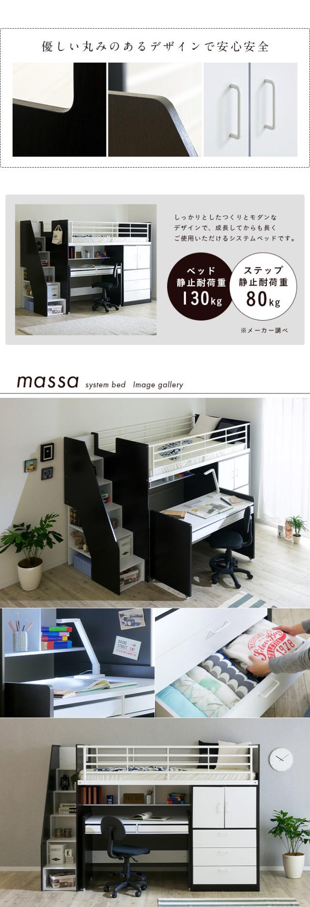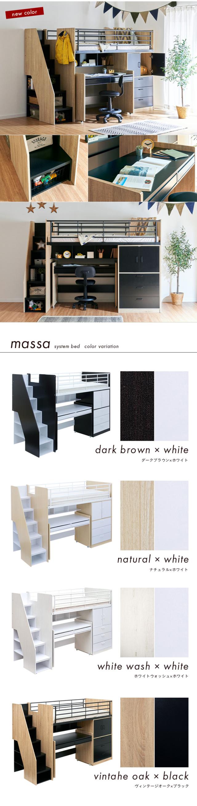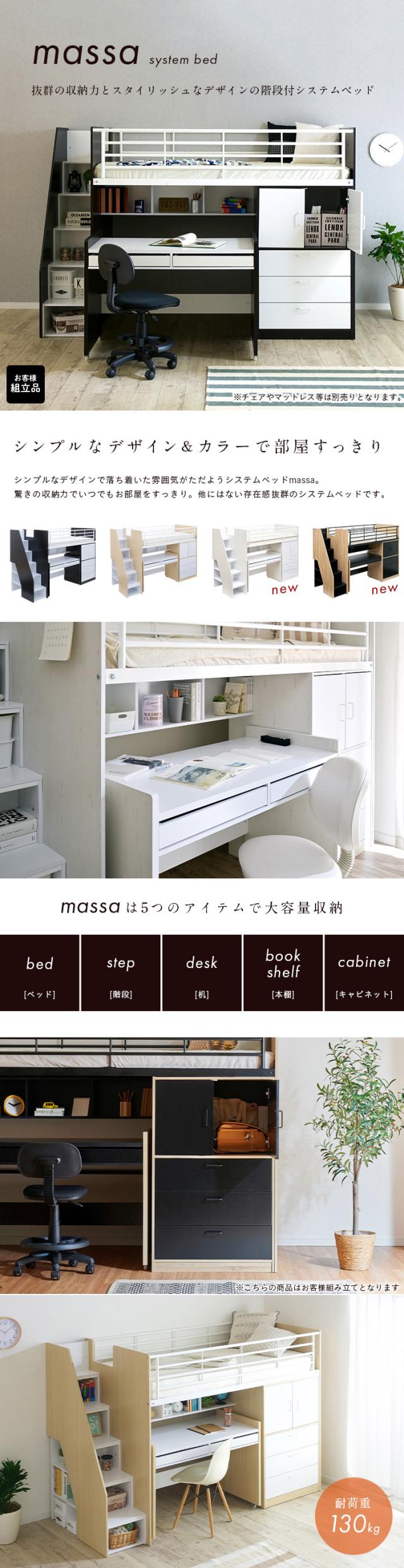 【大容量収納/階段付き】ロフトシステムベッド massa3(マッサ3) 4色対応 システムベッド ロフトベッド システムベッドデスク システムベット ロフトベット 子供用ベッド 子供 ベッド 階段 木製 子供部屋