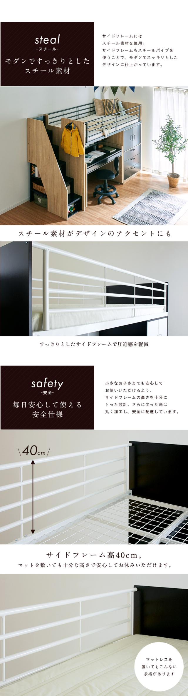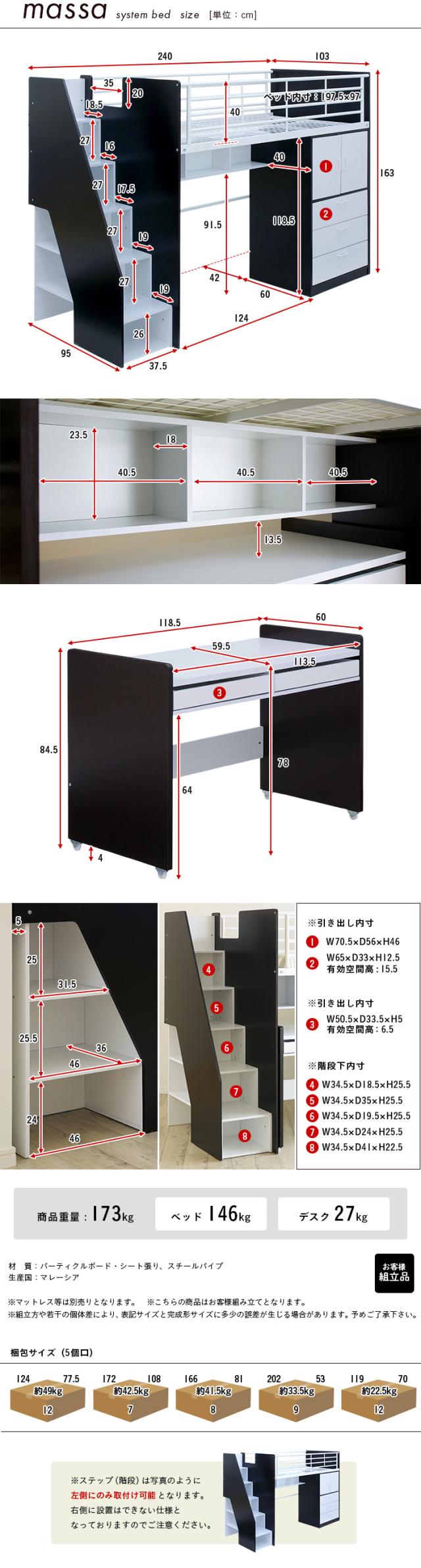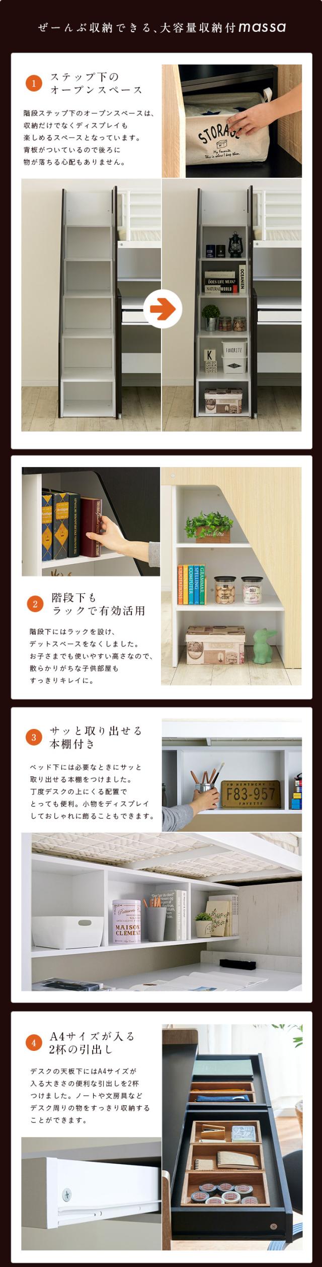 【大容量収納/階段付き】ロフトシステムベッド massa3(マッサ3) 4色対応 システムベッド ロフトベッド システムベッドデスク システムベット ロフトベット 子供用ベッド 子供 ベッド 階段 木製 子供部屋