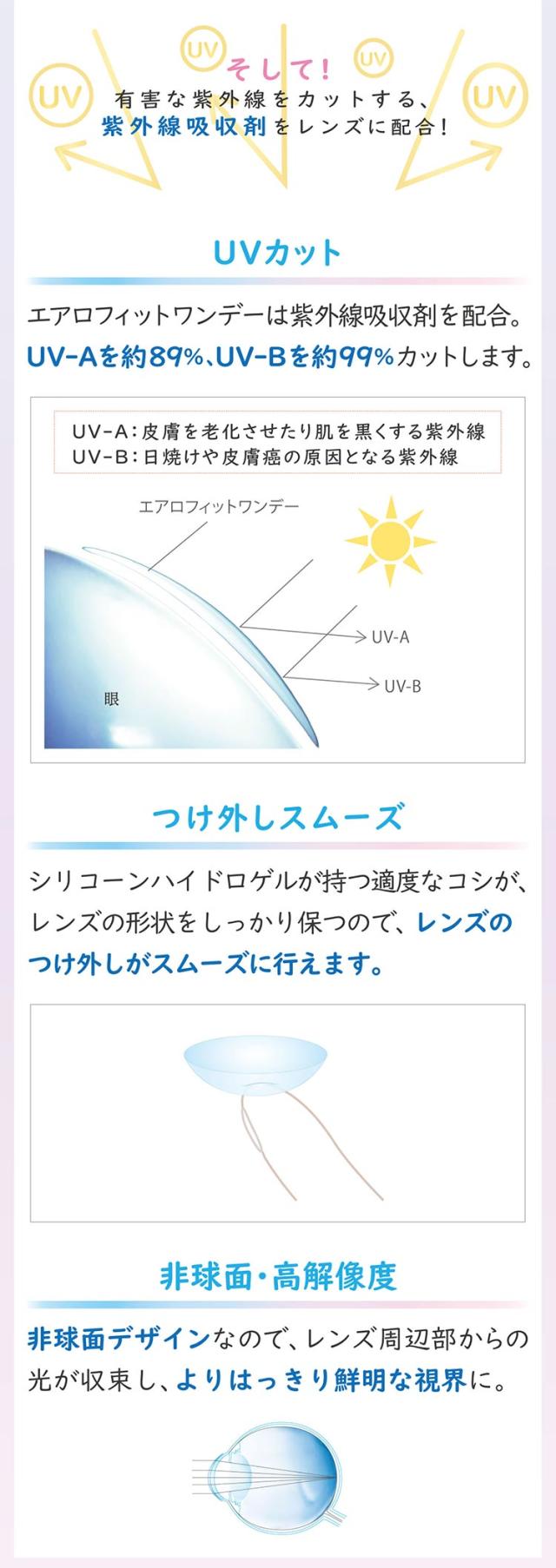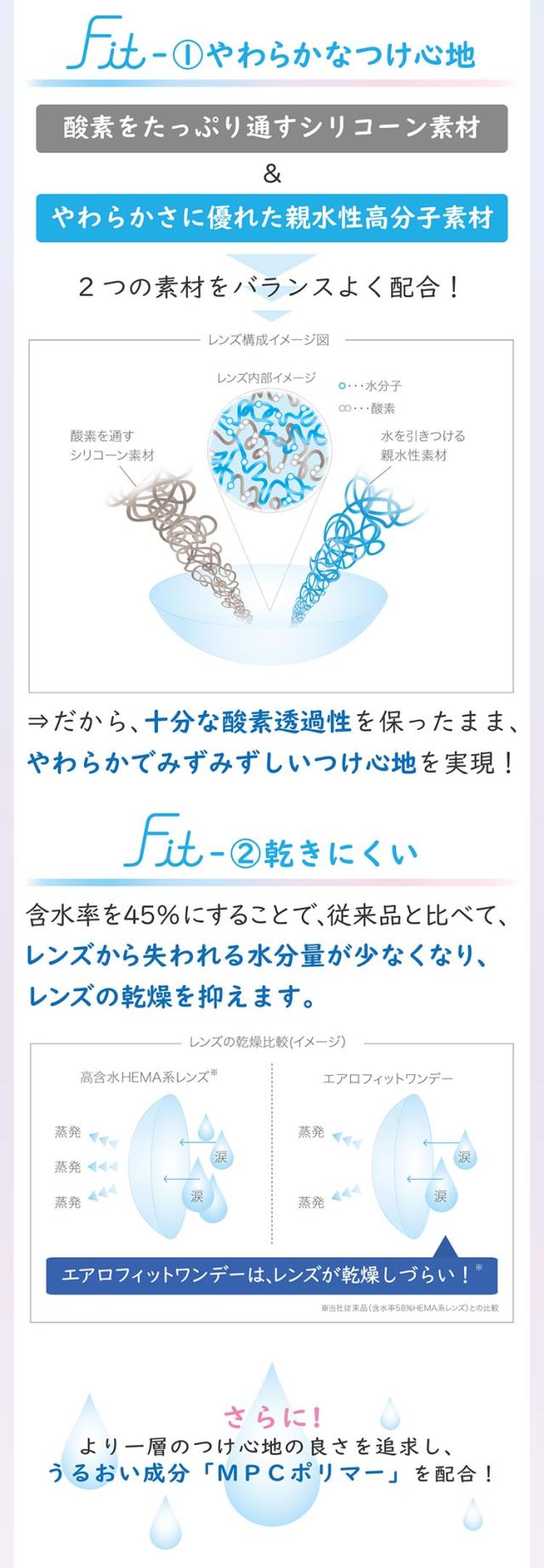エアロフィットワンデーは、酸素透過性と親水性高分子素材をバランス良く配合し、やわらかいつけ心地と乾きにくさを実現した1日使い捨てコンタクトレンズです。目の健康に不可欠な酸素を酸素透過性が高いシリコーンハイドロゲルで快適に通します。MPCポリマーでうるおいが続き、瞳に有害な紫外線もカットします。