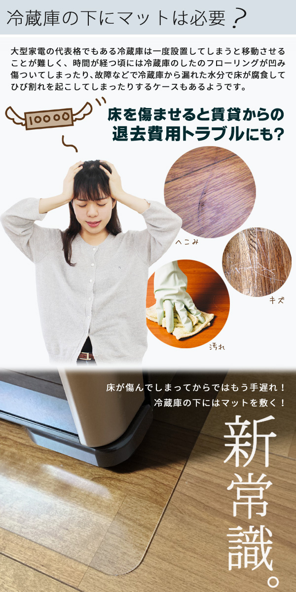 一度置いたら移動が難しい冷蔵庫を置く前にキズ防止マット一枚で床やフローリング、クッションフロアから傷や凹みから守ります!