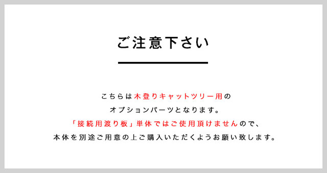 | 特記事項 | ※こちらはオプションパーツとなります。 木登りキャットポール本体を別途購入の上、お買い求め下さい。 ※片側のみを固定した状態では使用せず、必ず両側を固定の上、ご使用下さい。 | |