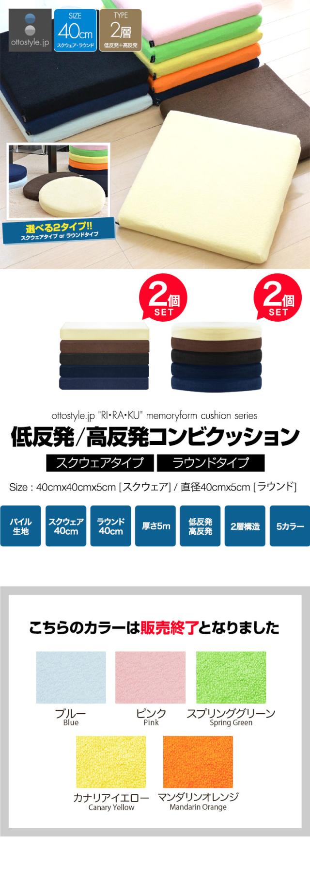 座布団 クッション 低反発 高反発 両面 2層 コンビクッション 2枚組 40×40cm×厚さ5cm 丸/ラウンド 四角/スクエア 洗えるパイルカバー 座ぶとん 代わり 腰 お尻 フロアクッション 椅子用 チェアクッション シートクッション 1年保証 送料無料