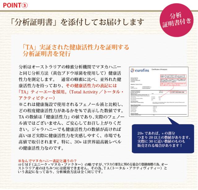 マヌカハニーと同様の検査方法で、オーストラリア分析機関より発行した証明書を添付してお届けします。