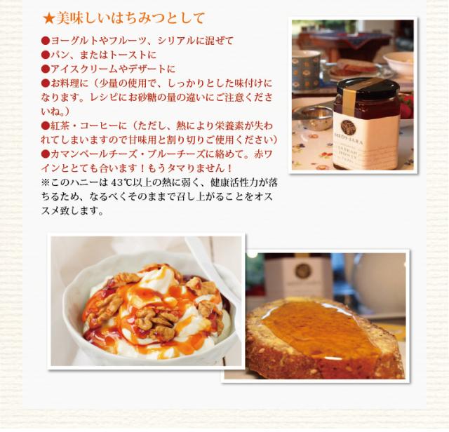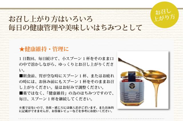 健康維持管理に1日数回、毎日続けて小スプーン一杯をそのまま口の中で溶かしながら、ゆっくりとお召し上がりください。美味しい蜂蜜として、ヨーグルトやフルーツ、シリアルに混ぜて、お料理やコーヒー・紅茶に入れてなど様々です。