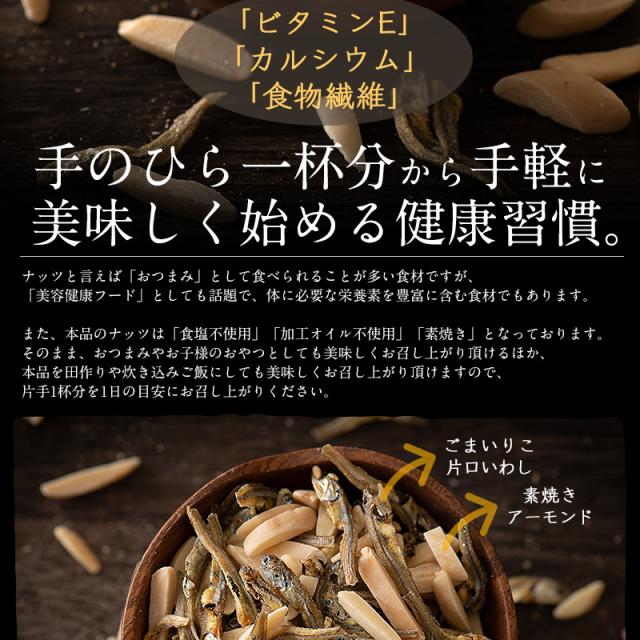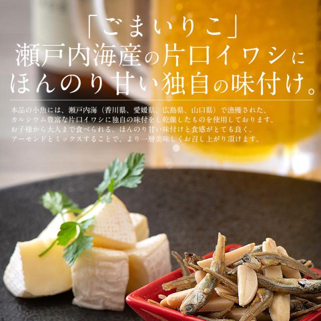 アーモンド(アメリカ産)、片口いわし(瀬戸内海産)、砂糖、マルトース、白ごま