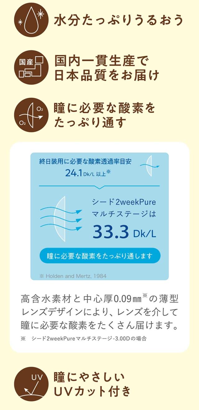 「シード 2ウィークピュアマルチステージ」は、すべての工程を日本国内で製造している、国産の遠近両用2週間使い捨てのコンタクトレンズです。独自のレンズ素材SIBで、汚れを防ぎつつ水分を保持します。これ1枚のレンズで近くも遠くも自然に見ることができます。