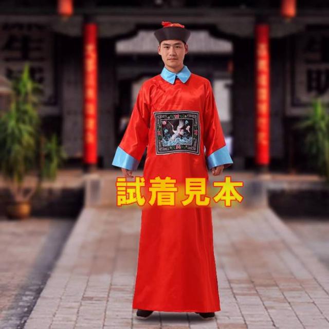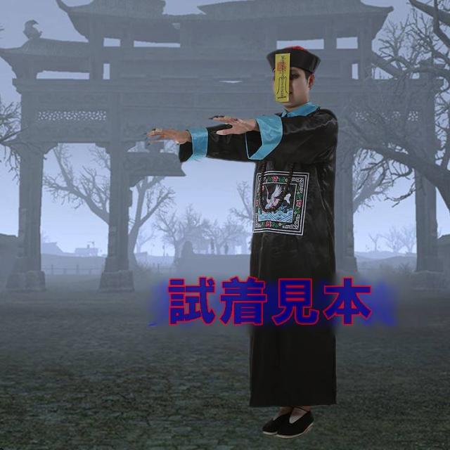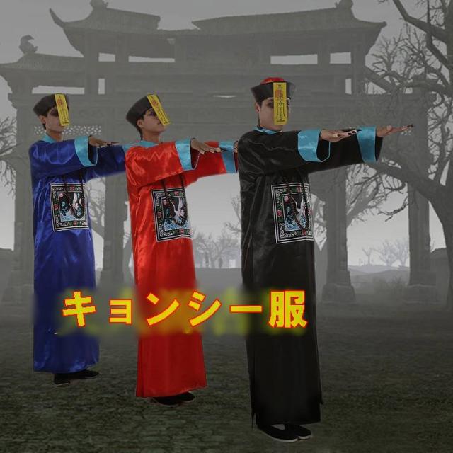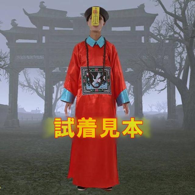 宮廷正装 長袍・チャンパオ 霊幻道士服・キョンシー服セット(中華帽子・霊符1枚付属) 赤色 フリーサイズ