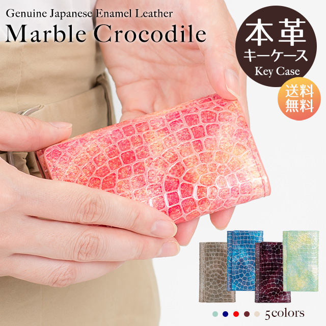 クロコダイル模様が型押しされたエナメルレザーと、美しい配色のマーブル模様がマッチした、個性的なデザインのキーケースです。
