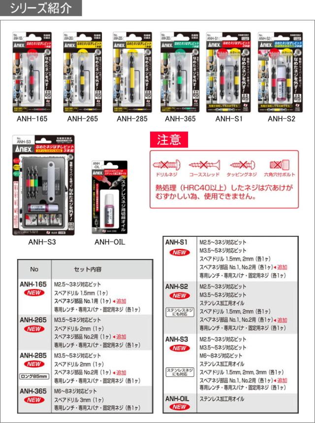 | 使用時の注意 | ネジのサイズにあったものをご使用下さい。 ビットの取付、取外しは動力源のスイッチを切って行ってください。 製品は改造せずに正しくご使用ください。 HRC40以上の熱処理をしたネジには穴あけが難しいため使用できません。 ご使用には電動ドライバーが必要です。 過負荷により、ドリル部・ネジ部が折れないよう電動ドライバーのインパクト衝撃を避け、ビットを垂直にして作業をしてください。 |