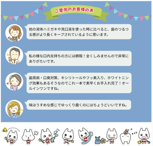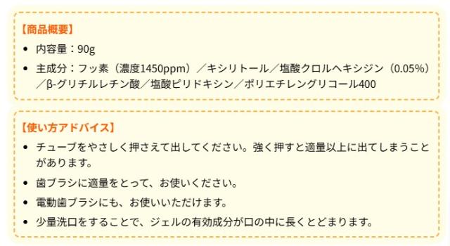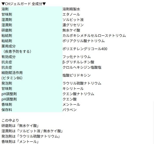 有効成分:ポリエチレングリコール400、フッ化ナトリウム(フッ素)、β-グリチルレチン酸、クロルヘキシジン塩酸塩、トラネキサム酸、ピリドキシン塩酸塩