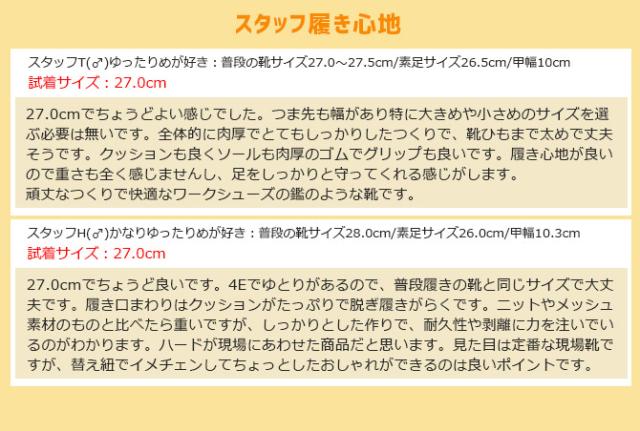 | 素材・仕様 | アッパー:合成皮革 ソール:ウレタン2層底・耐油底 インソール:取外し可 先芯:鋼製先芯(JSAA-A種合格品) 靴幅:EEEE(4E) 重量:約450g(26.0cm片足) | |||||