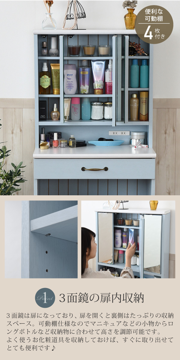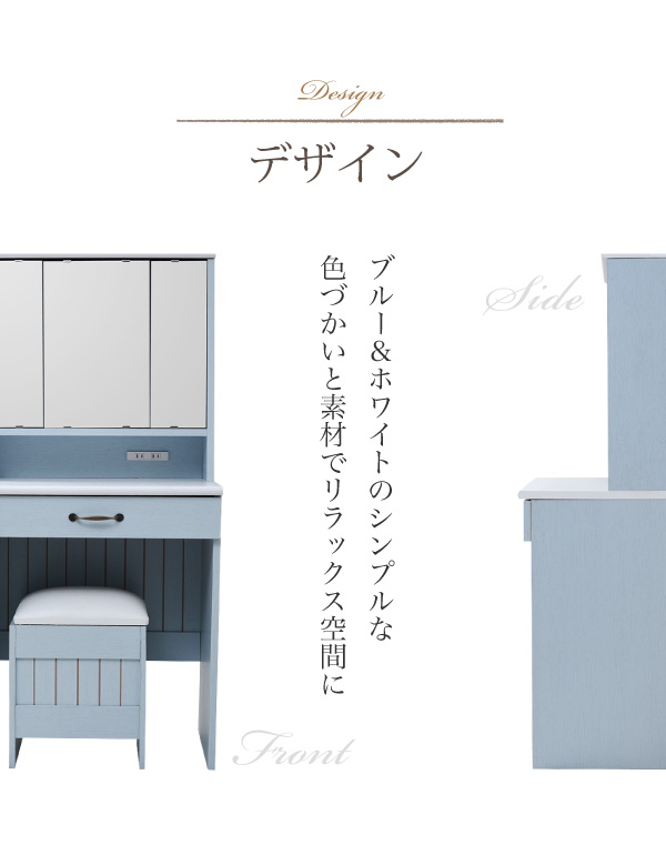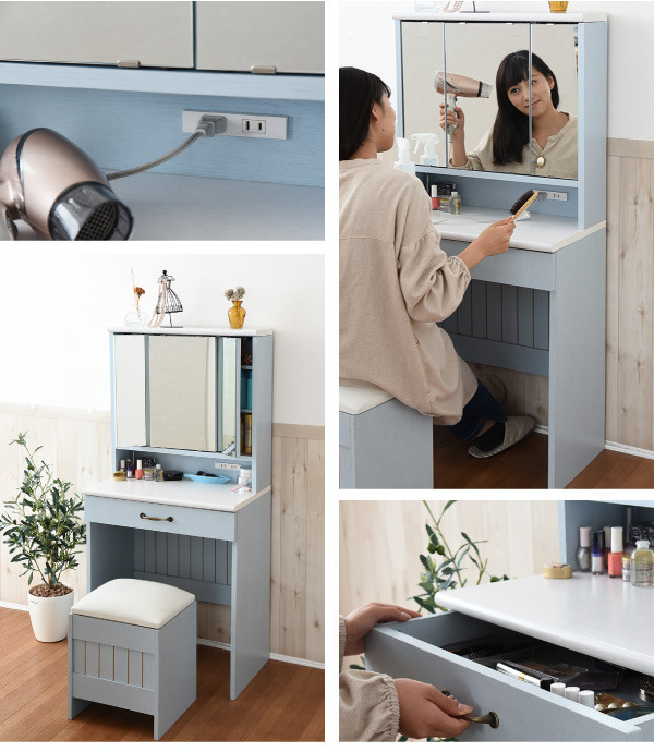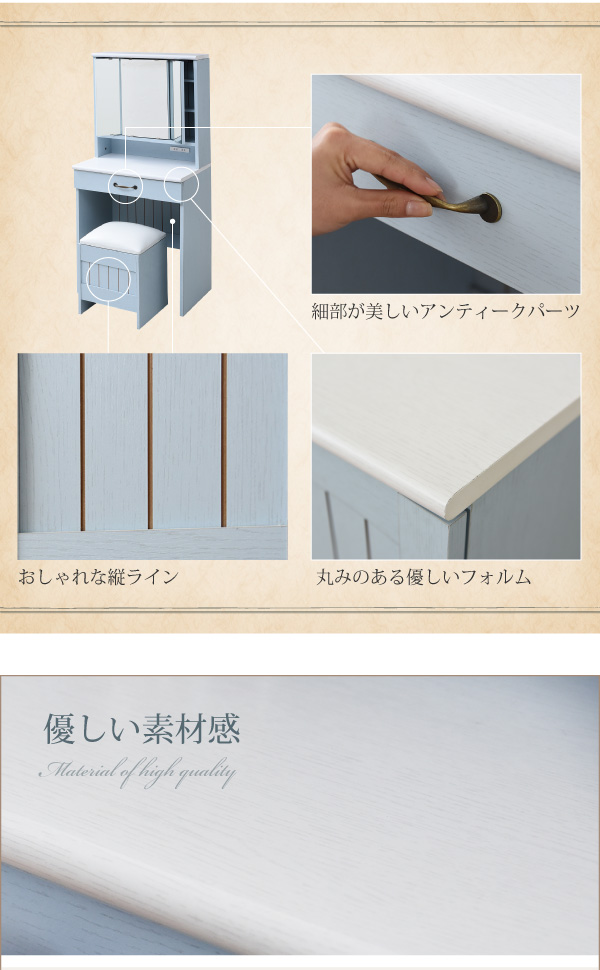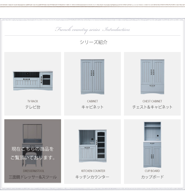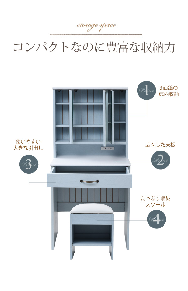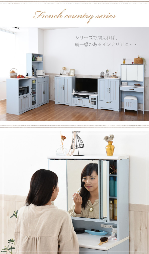 ドレッサー おしゃれ 収納 三面鏡 鏡面台 化粧台 コンパクト スツール付き カラーとディテールで魅せるフレンチカントリー三面鏡ドレッサー