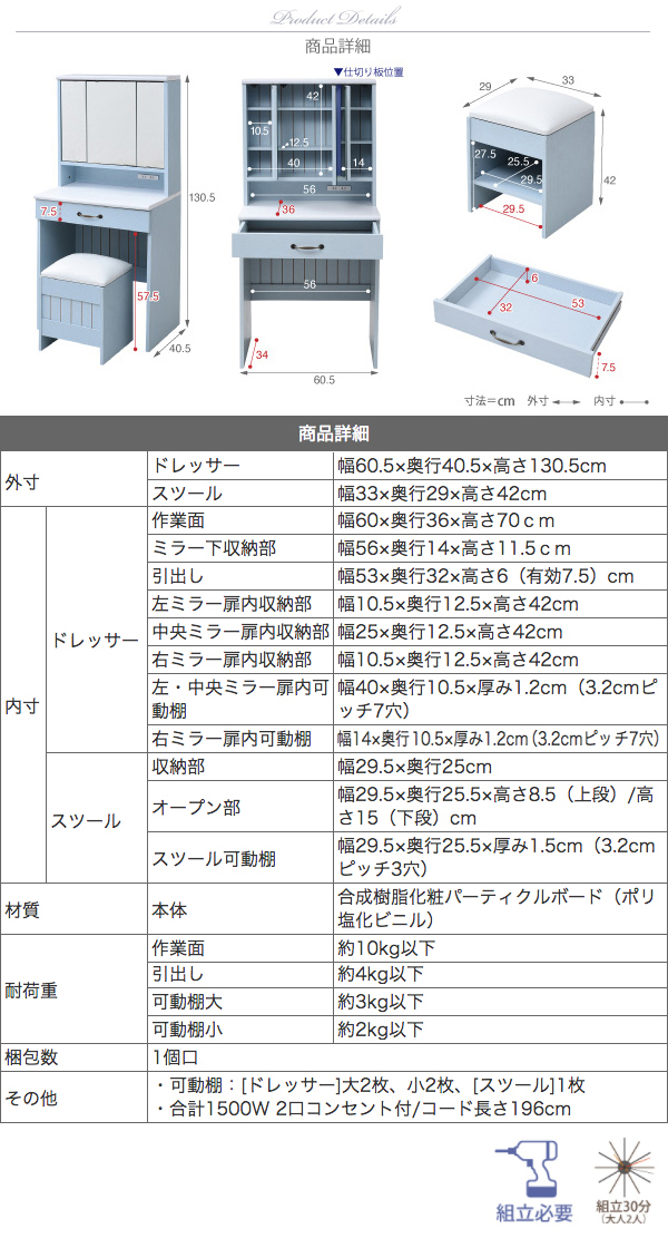 ドレッサー:幅60.5×奥行40.5×高さ130.5cm