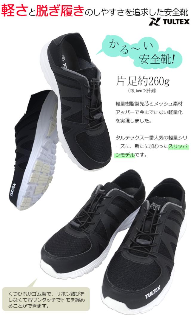 | TULTEX(タルテックス)のつま先部分に樹脂先芯が入ったスニーカータイプの超軽量安全靴AZ-51655です。 結ばない、ほどけない、伸びるゴム靴ひもがついた踵が踏めるタイプですので脱ぎ履きの回数が多い職場に最適です。 メッシュ素材で通気性が良く、ムレを軽減してくれ、クッション性の高いソールを使用しているので履き心地も良く、内装業、引っ越し業、室内履き、病院、介護職、ビルメンテナンスなど、いろいろな軽作業に活用できる多機能モデルです。女性にもオススメなシンプルでスポーティーなルックスもポイントです。 | ||||||