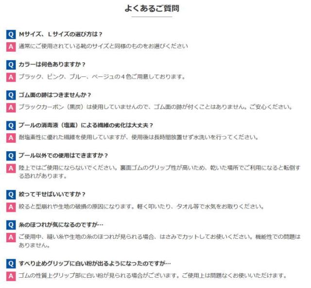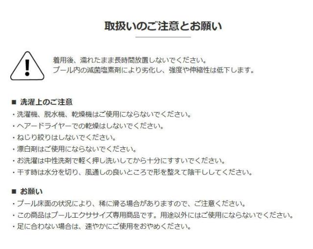 | お願い | 着用後、濡れたまま長時間放置しないでください。 プール内の減菌塩素剤により劣化し、強度や伸縮性が低下します。 プール床面の状況により、稀に滑る場合がありますので、ご注意ください。 この商品はプールエクササイズ専用商品です。用途以外にはご使用にならないでください。 足に合わない場合は、速やかにご使用をおやめください。 |