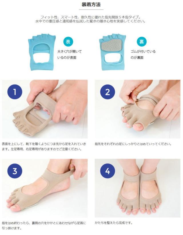 - プールでのフィットネスに使用するために購入しました。 素足の時に比べれば滑りにくいので使用感は良いです。 ただ履く時五本指を一本づつ入れるのが少し大変かも。