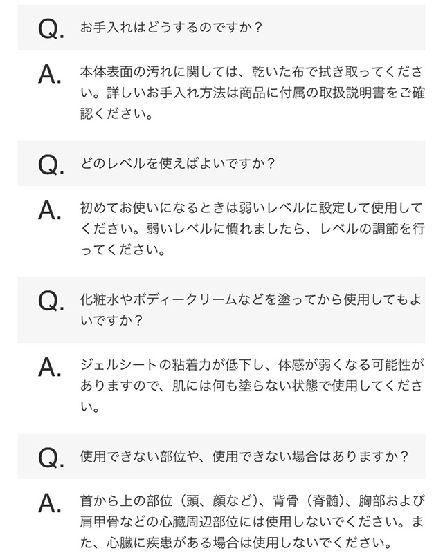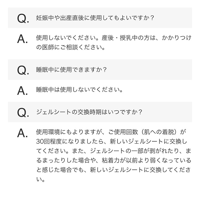 ・アレルギー体質の方・皮ふに知覚障害や異常(感染症、皮ふ炎や傷など)のある方・血行障害のある方・薬を服用中の方・悪性腫瘍のある方・脳神経に異常を感じている方(てんかんなど)・糖尿病などによる高度な末梢循環障害による知覚障害のある方・発熱(38℃以上)している方・安静を必要とする方・脊椎の骨折、ねんざ、肉離れなどの急性(疼とう痛性)疾患のある方・骨粗しょう症など、骨に異常のある方・血圧に異常がある方・ジェルシートが肌に合わない方・特に身体に異常を感じている方・その他医療機関で治療中の方