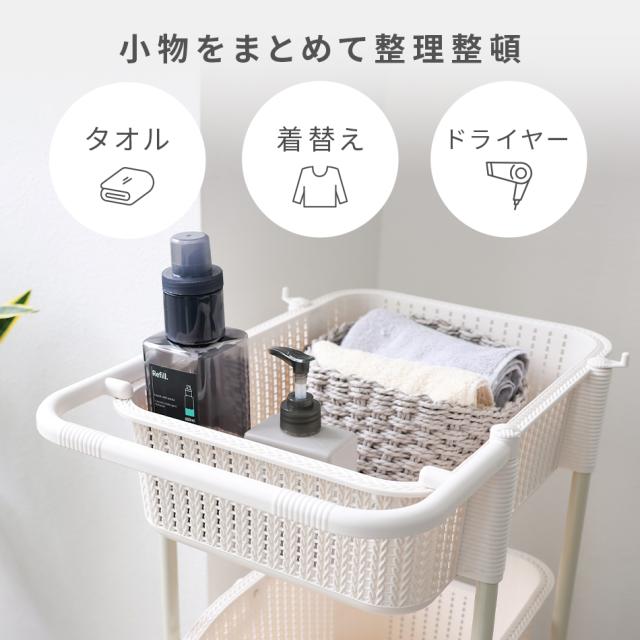 上段の浅バスケットにはバス用品、洗濯機まわりの小物が収納できます。