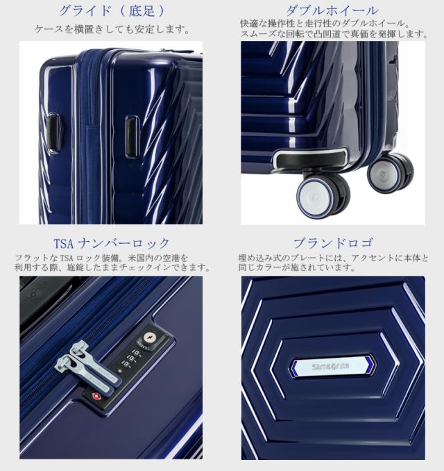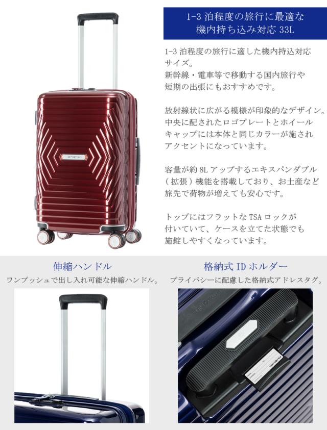 1-3泊程度の旅行に適した機内持込対応サイズ。新幹線・電車等で移動する国内旅行や短期の出張にもおすすめです。放射線状に広がる模様が印象的なデザイン。中央に配されたロゴプレートとホイールキャップには本体と同じカラーが施されアクセントになっています。容量が約8Lアップするエキスパンダブル(拡張)機能を搭載しており、お土産など旅先で荷物が増えても安心です。トップにはフラットなTSAロックが付いていて、ケースを立てた状態でも施錠しやすくなっています。