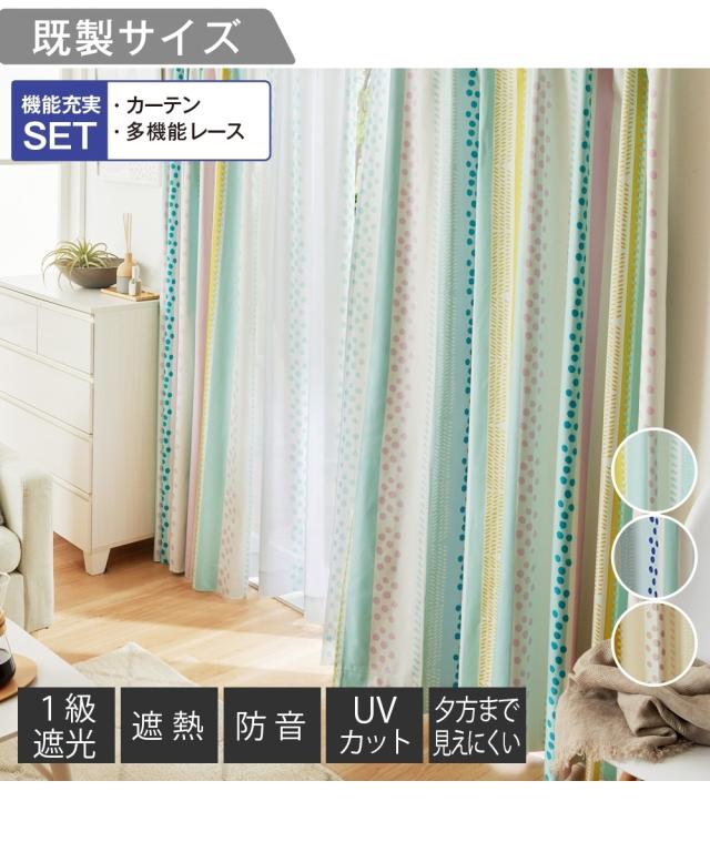 [keyword] 家具 収納 インテリア 遮光 遮熱 防音 遮音 外から見えにくい 遮像 UVカット 夏 外 おでかけ イベント 肌 レジャー ストライプ 柄 かわいい おしゃれ 幾何学柄 ポップ カジュアル 一人暮らし 大学生 社会人 ワンルーム 1K 1DK 新生活 [comment] カーテンには遮熱・防音・遮光の機能を、レースカーテンには遮熱と見えにくい機能を持たせた多機能セット。