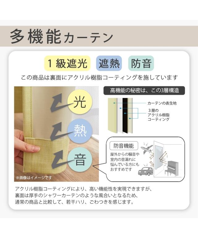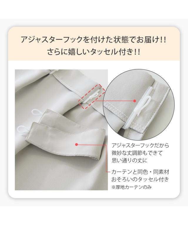 ●セット内容:カーテン2枚・レースカーテン2枚の計4枚セット カーテン●品質:ポリエステル100%(裏面=アクリル樹脂コーティング)●遮光率=99.99%、断熱効果率=36%、レースカーテン●品質:ポリエステル100% ●紫外線カット率=94%、断熱効果率=16% ※紫外線カット率・断熱効果率は第三者機関にて試験的に測定した数値です。ご利用になる環境によって効果は異なります。●アジャスターフック付 ●カーテンと共生地のタッセル付