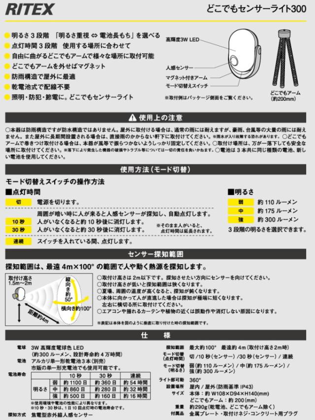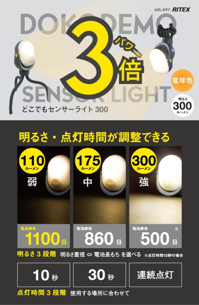 どこでもセンサーライト 300 (ASL-097) 送料無料 屋内 屋外 アウトドア 電池 LED センサー ライト 懐中電灯 照明