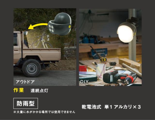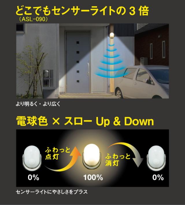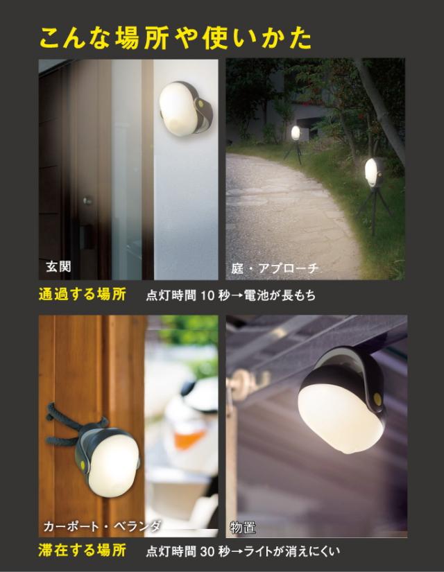 | 特徴 | 従来のどこでもセンサーライト(ASL-090)の3倍のパワーでより明るく、より広く照らします。 使用する場所に合わせて、明るさ・点灯時間を3段階で調節可能。 より強度が増した三脚で様々な場所に取付可能。 三脚の形を変えることでフェンスや柱など垂直な場所や物干し竿などに引っ掛けて使用できます。 三脚を外せば強力マグネットが出現。物置やロッカーなどマグネットが付く場所でご利用いただけます。 防雨構造なのでアウトドアでも活躍。 ※防水構造ではないので大量に水がかかる場所では使用できません。 最長4m×100°の範囲で人や熱源を探知。 センサー時、周囲が暗い時に人が来ると人感センサーが探知し、自動点灯。(人がいなくなると約10秒後/30秒後に消灯) |