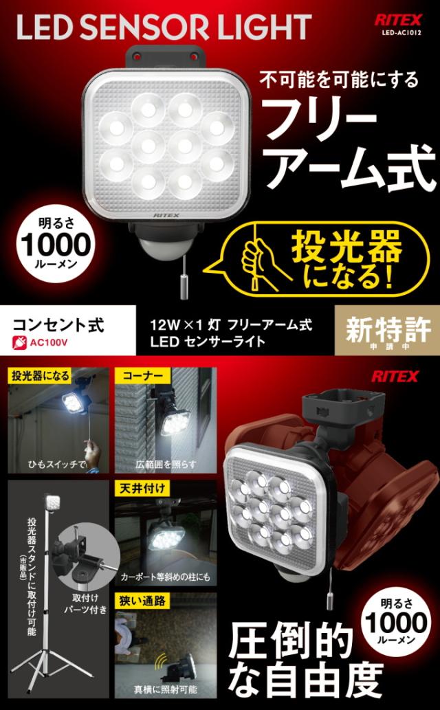 12W×1灯 フリーアーム式 LEDセンサーライト (LED-AC1012) 送料無料 屋内 屋外 コンセント式 LED センサー ライト 照明