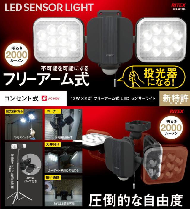 12W×2灯 フリーアーム式 LEDセンサーライト (LED-AC2024) 送料無料 屋内 屋外 コンセント式 LED センサー ライト 照明