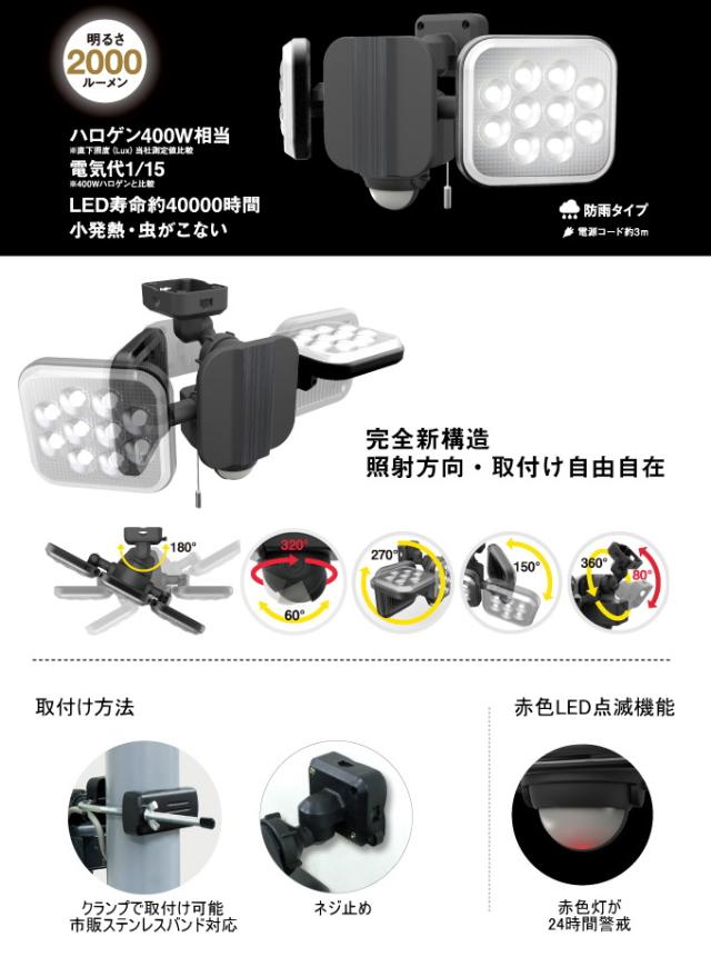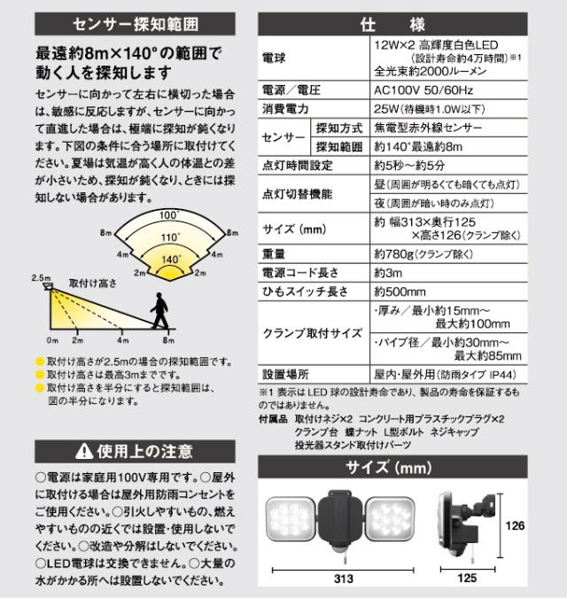 | 特徴 | フリーアーム式で照射方向・取付け自由自在! 業界初のひもスイッチ付きで常時点灯も可能。 12W×2LEDで2方向を同時照射。 コーナー・天井付け・狭い通路など様々な場所に設置できます。 探知センサーで自動点灯・自動消灯。 センサーをお好みのモードに設定できます。 侵入者を警戒し、家族を便利に照らします。 ネジ取付け、クランプ取付け、ステンレスバンド取付け(別売)が可能。 市販の投光器スタンドに取付け可能。(取付けパーツ付き) 発熱が少なく、虫が集まりにくい。 最長約8m×140°の範囲で人や熱源を探知しますが、取付け環境でセンサー探知が変化します。 取扱説明書をよくお読みになり、正しく取付けてください。 |