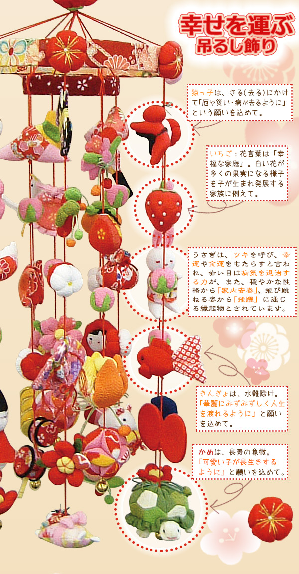 ●輝く太陽、そして向日葵のように元気で明るい子に育ちますように、という願いが込められています。伝統のお細工を二重の輪にたくさん吊るした華やかな吊るし飾りです。