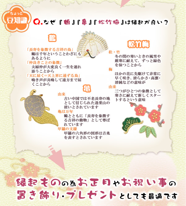 ちりめんでできた表面には、「鶴」「亀」「松竹梅」の柄が刺繍されています。