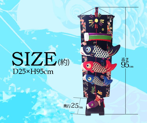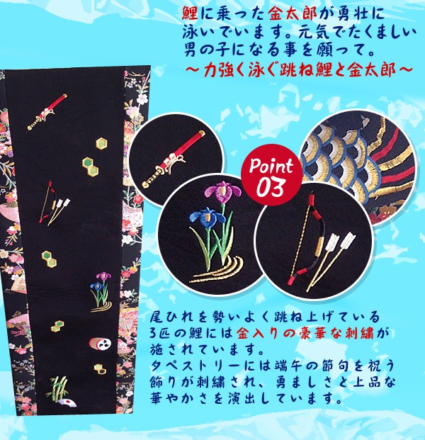 尾ひれを勢いよく跳ね上げている3匹の鯉には金入りの豪華な刺繍が施され、タペストリーには端午の節句を祝う飾りが刺繍された、勇ましさと上品な華やかさを演出する脇飾りです。